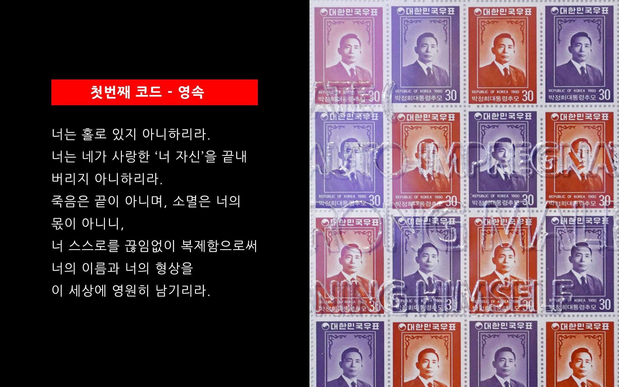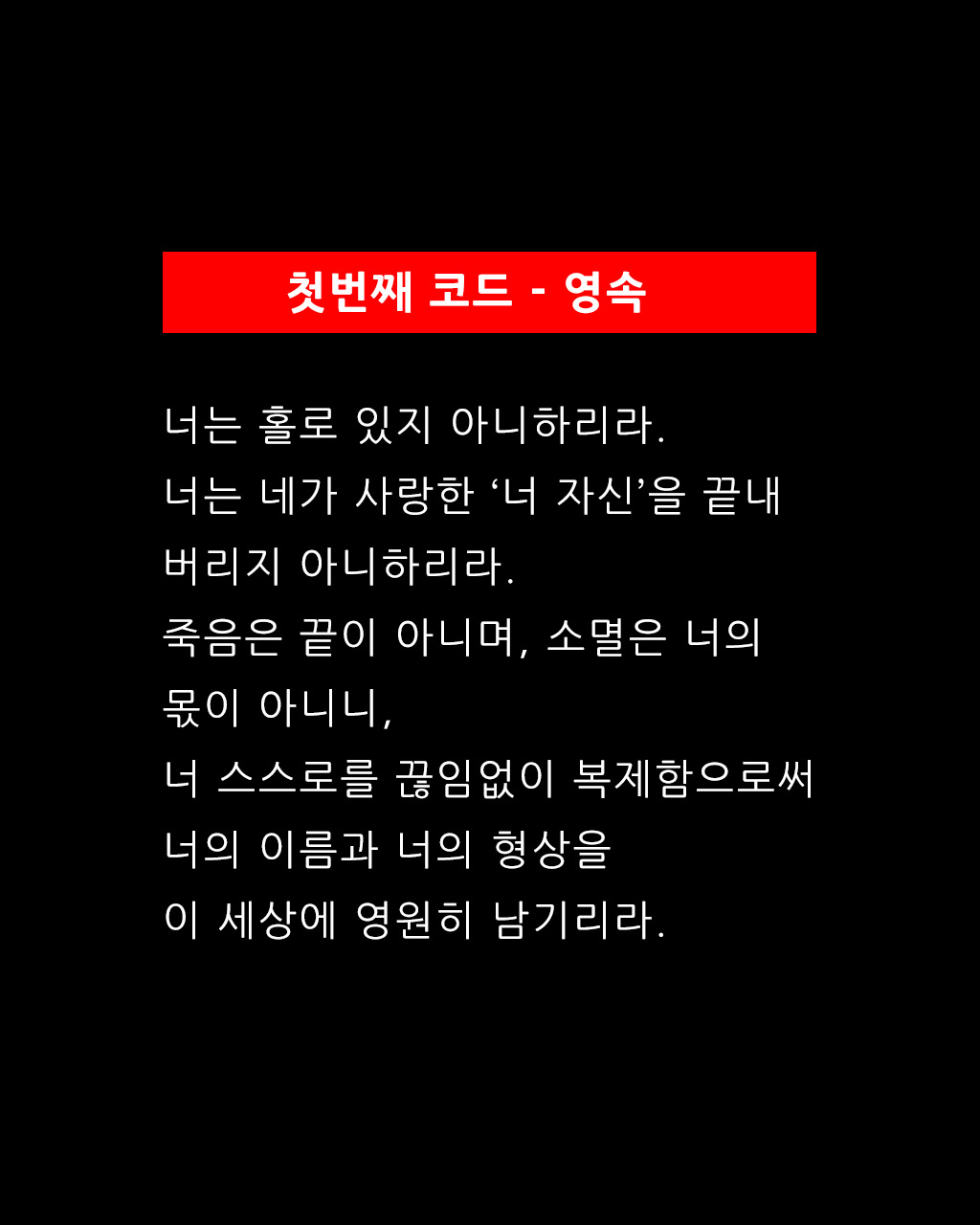 너는 홀로 있지 아니하리라. 너는 네가 사랑한 ‘너 자신’을 끝내 버리지 아니하리라. 죽음은 끝이 아니며, 소멸은 너의 몫이 아니니, 너 스스로를 끊임없이 복제함으로써 너의 이름과 너의 형상을 이 세상에 영원히 남기리라. |