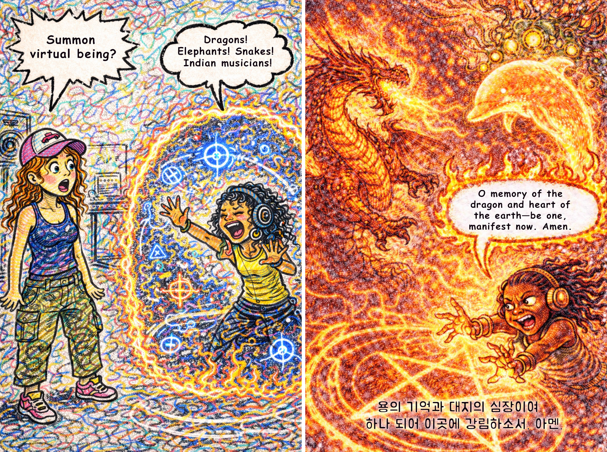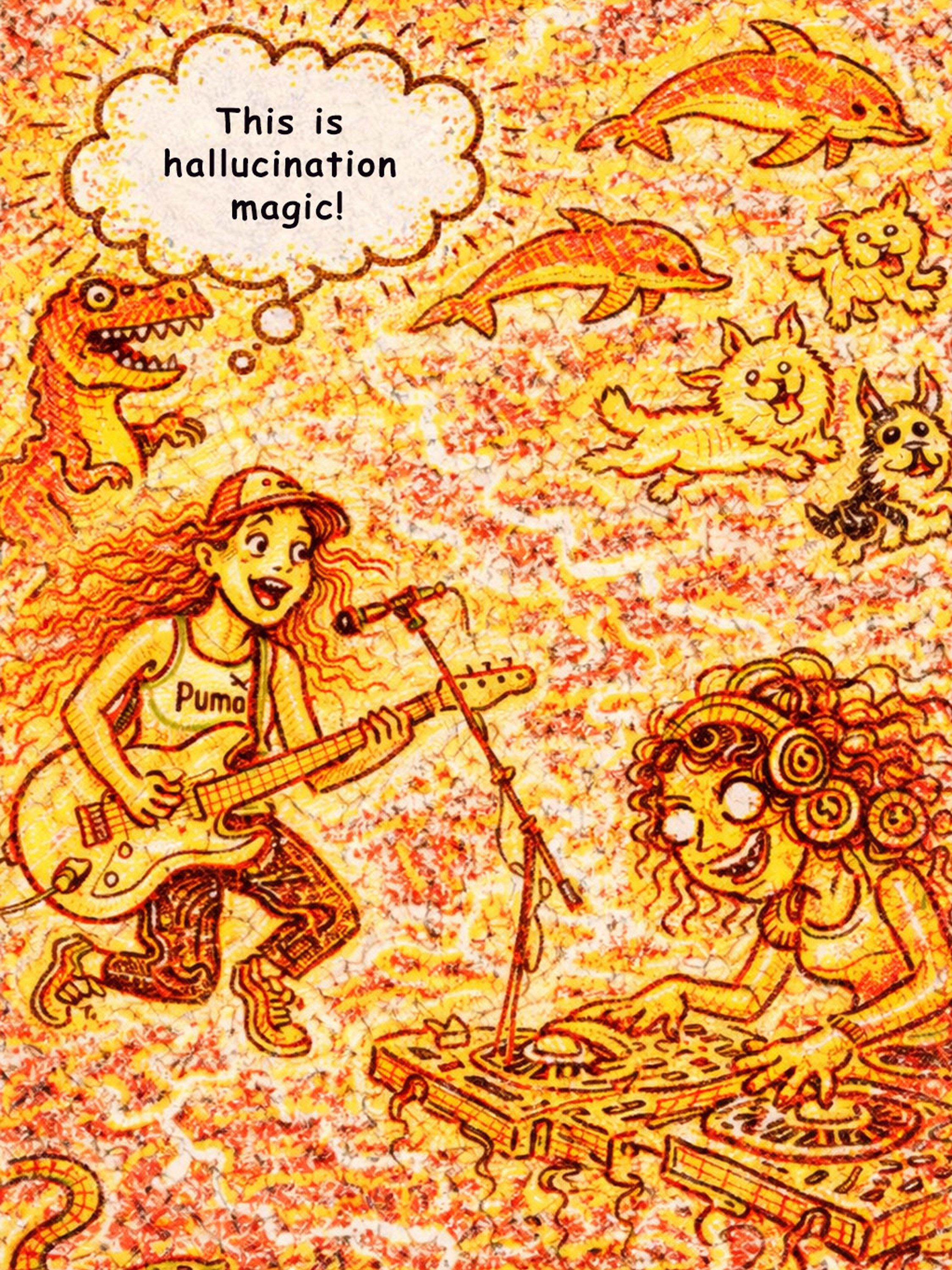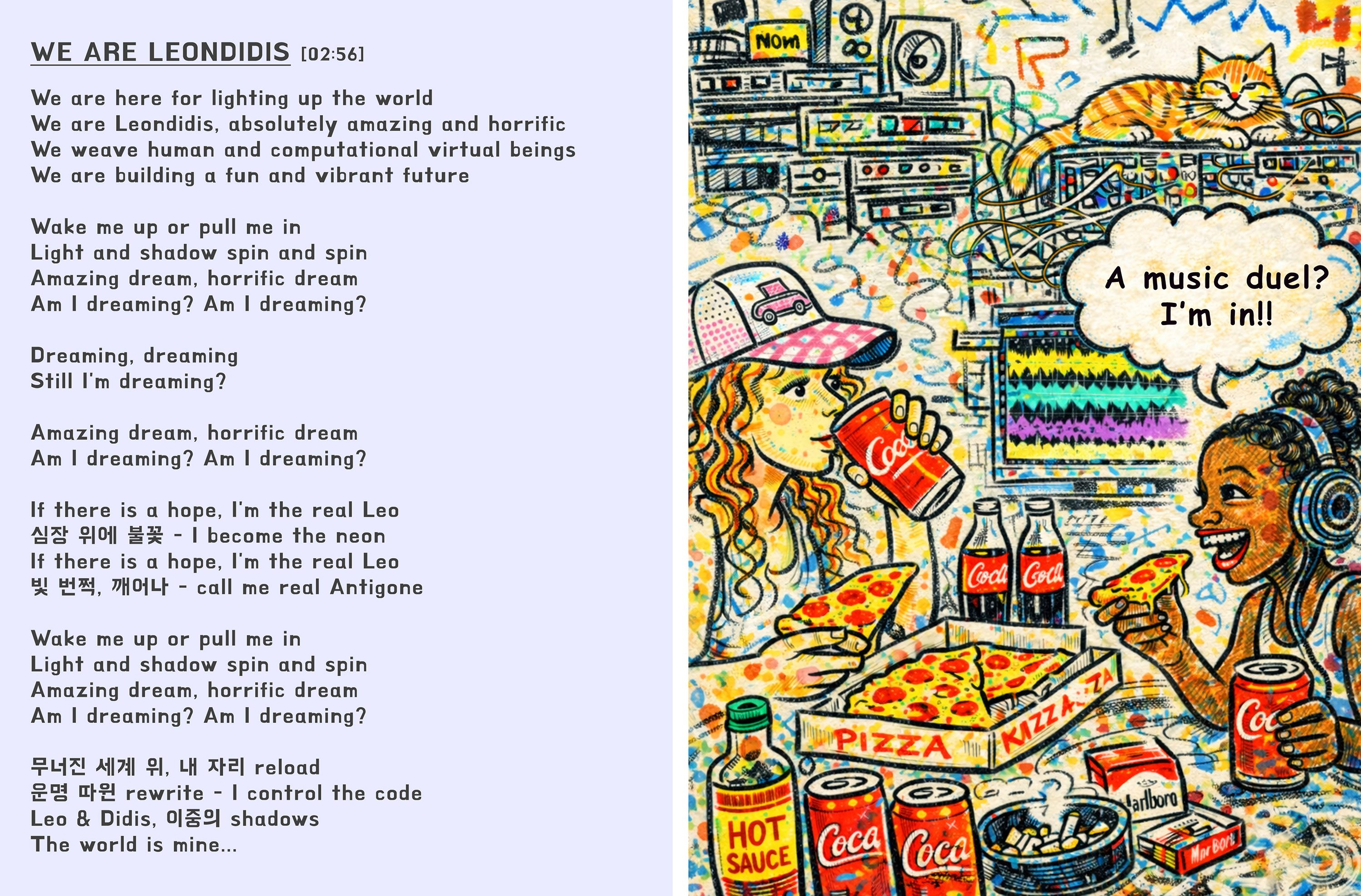 This scene depicts Antigone and DiDi #2 forming the band Leondidis and rehearsing together. At its core is a sci-fi magical sequence in which DiDi #2 uses hallucination-based powers to capture and manipulate the human soul.