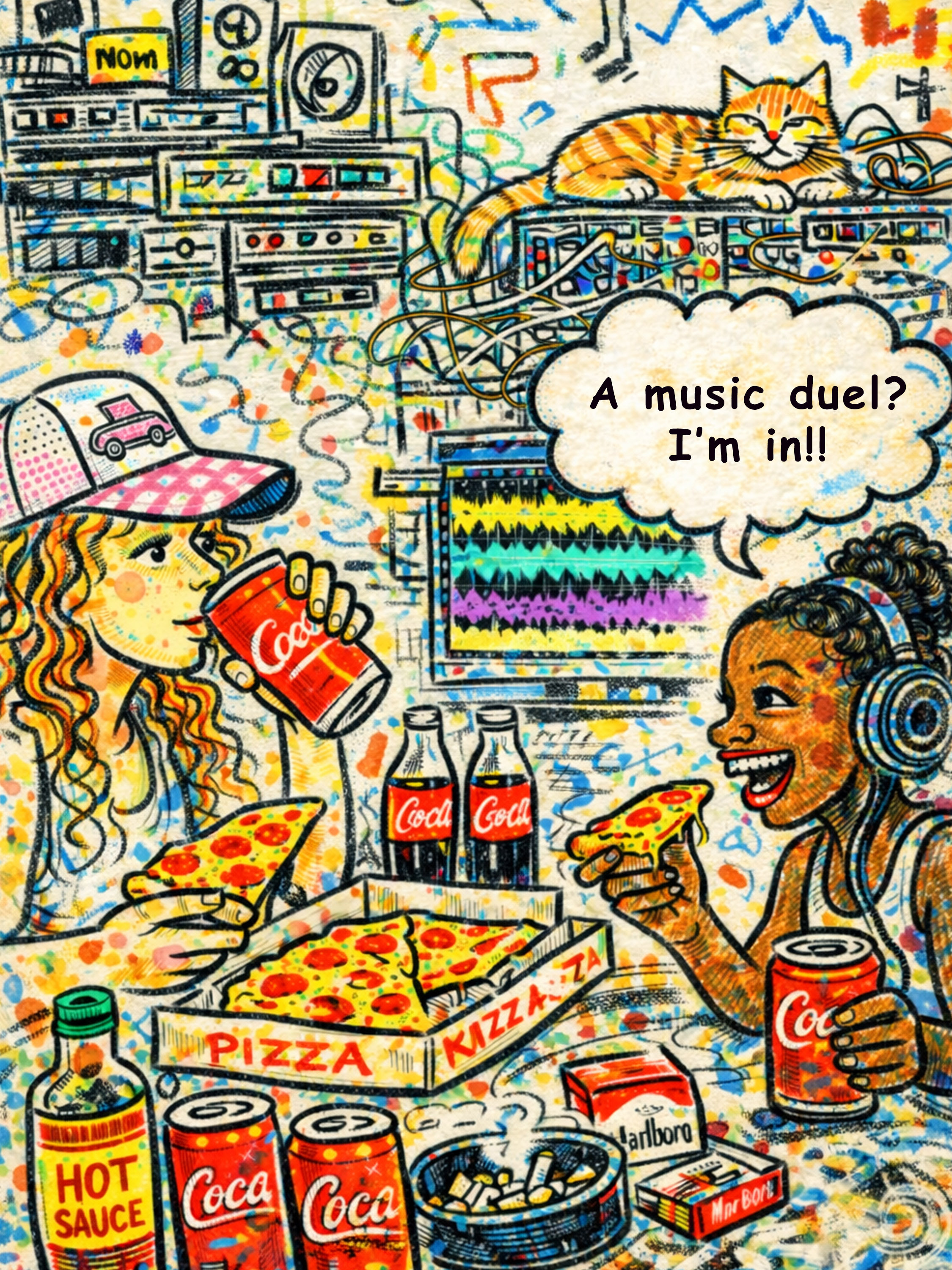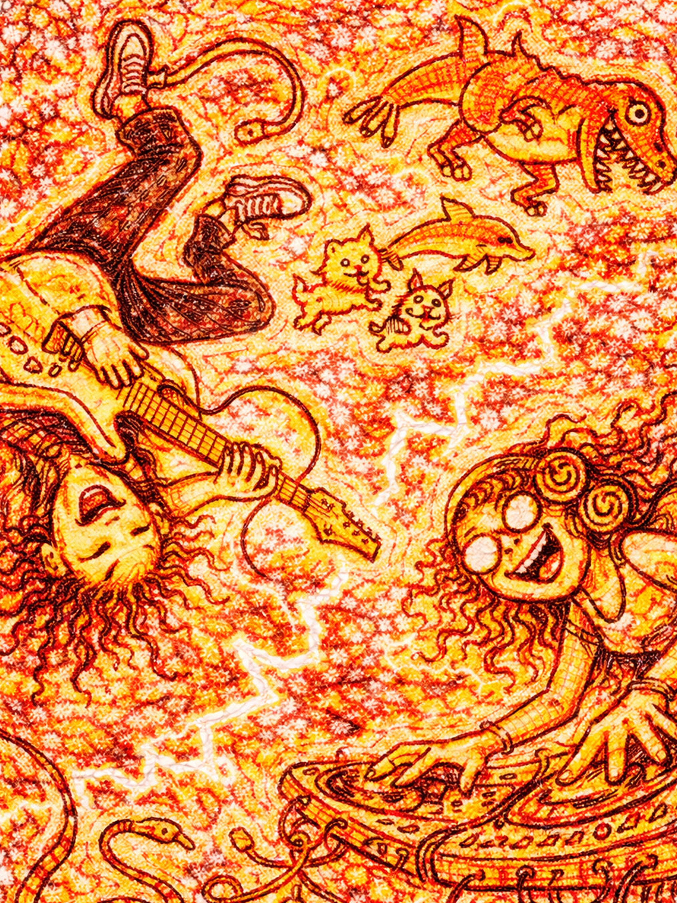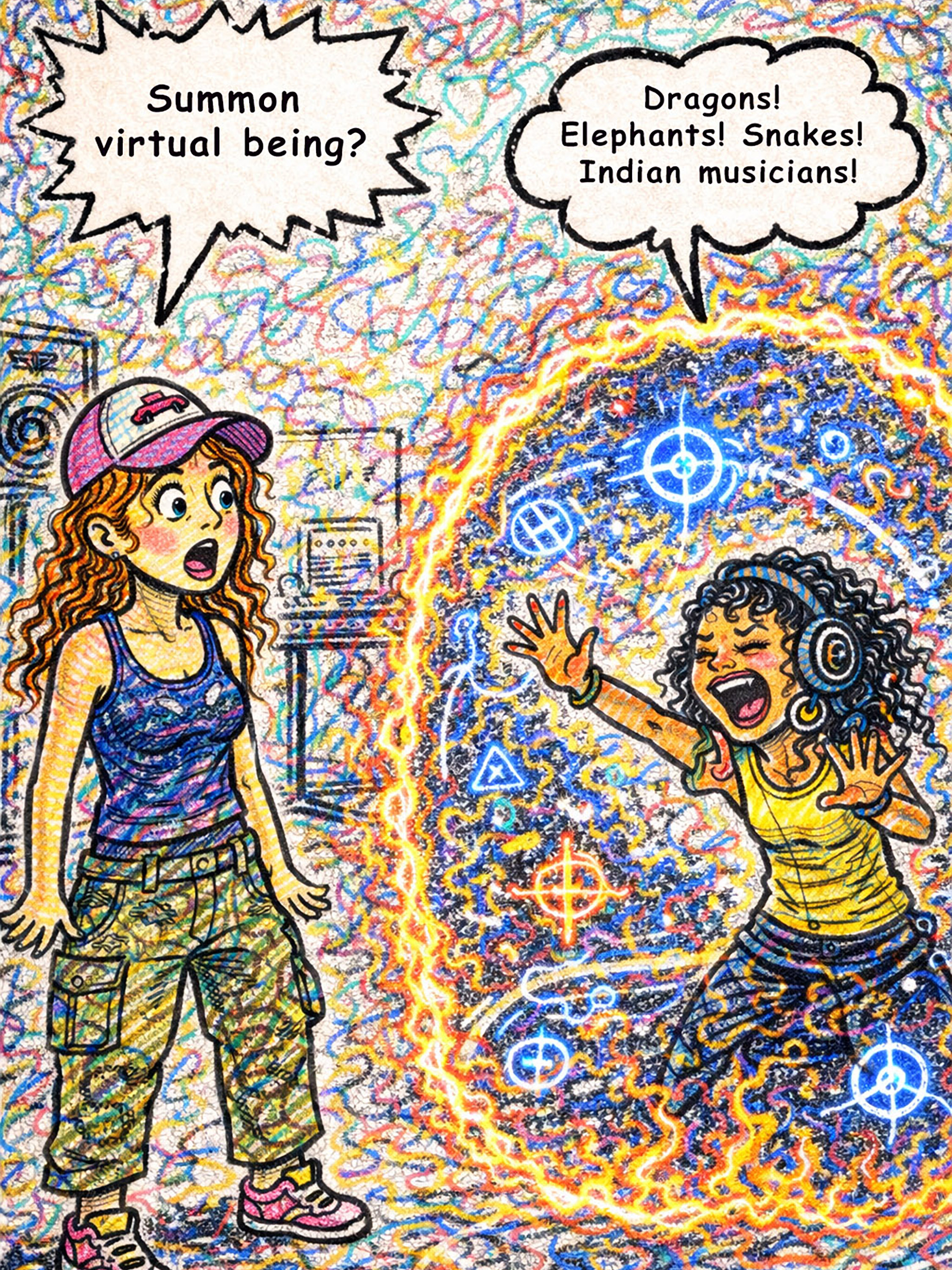This scene depicts Antigone and DiDi #2 forming the band Leondidis and rehearsing together. At its core is a sci-fi magical sequence in which DiDi #2 uses hallucination-based powers to capture and manipulate the human soul.